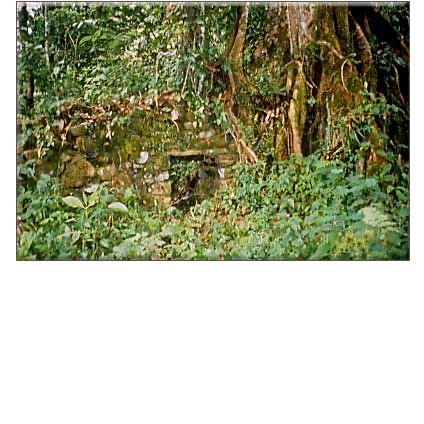 The next day we had to begin the long return trip upriver. We had done all we planned, but there was half a roll of extra-fast film left and I decided to go back into the city alone for a few more shots before breakfast. The low-lying area west of the plaza [Figure 53] was thickest of all and it received so little daylight that even using special film, I had to cut away lots of vines and foliage to get decent pictures. It was a tedious routine because I had to cut and then check the light, cut and check, over and over again. A machete in the jungle is much like an ice axe in the mountains. When needed, it's needed badly, but at all other times it is just in the way. To free both hands for the light meter, I got into the careless habit of sticking mine in the ground, blade first, but it wasn't smart. Anything left loose in the jungle blends quickly into the foliage and is easily lost. Still, I figured a few final shots wouldn't make any difference. Not so. I had just snapped my very last picture when I got the feeling something was wrong. It took a minute to realize the machete was missing. Not only did I need it to get out of there, but, I belatedly recalled, it was special. I traded it from a Negrito pygmy in the Philippines when I was there with the Marines back in the 1960s. Unlike the Collins & Co. el cheapos, available for a buck or two in every mercado in Latin America, my machete was forged from an old World War II jeep spring and had a hand-carved handle made from water buffalo horn. Over the years, I came to think of it as an old and valued friend. I looked everywhere, but couldn't find it. Frantic, I went back over every step I had taken since I last remembered having it in my hand, but it was gone. Perhaps it was Tupac Amaru's way of telling me, "Go home, gringo! There's nothing more for you to do here."